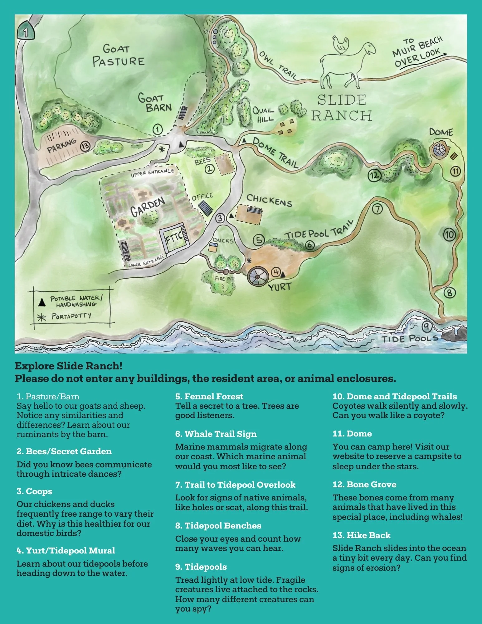 Areas Open to the General Public include: the Owl Trail, Tide Pool Trail and Tide Pools, the Dome Trail and Dome Meadow area, Area around the Pasture and Barnyard outside of all fences and gates, Yurt Picnic Area, Garden, visitor upper parking lot. Slide Ranch is a wonderful place for a walk and picnic overlooking the ocean!